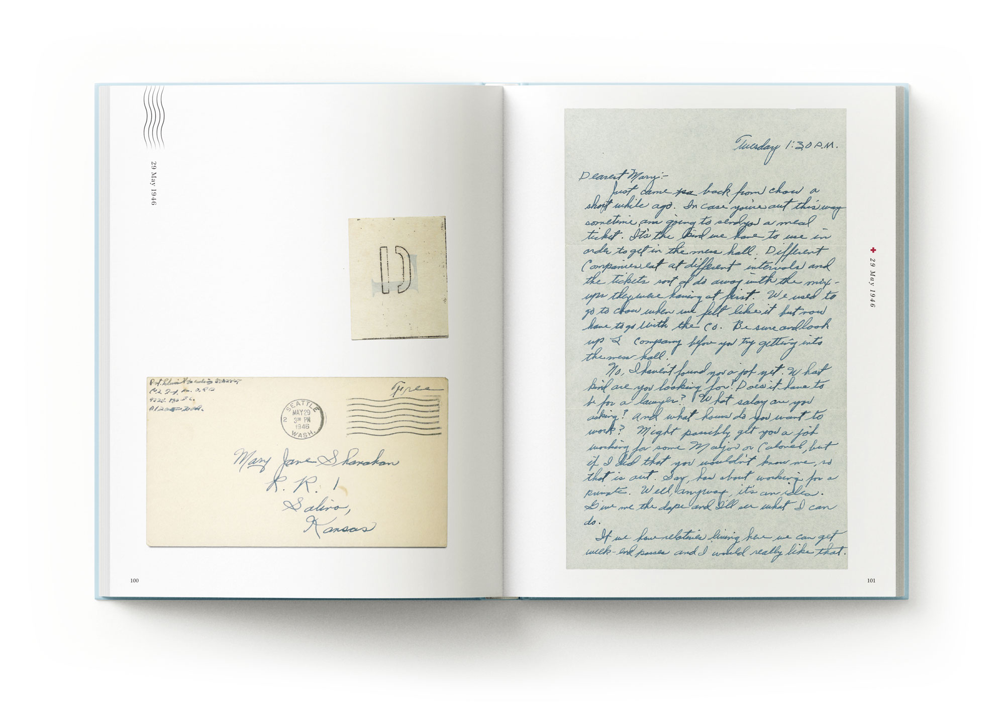 This 218-page book presents a curated collection of scans from the original letters. The design embraces a minimalist, restrained aesthetic to allow the letters to take centre stage. Subtle graphic elements drawn directly from the correspondence, are woven throughout, including the red cross from the hospital stationery Ed used and the air-mail waves and circular stamp motifs.