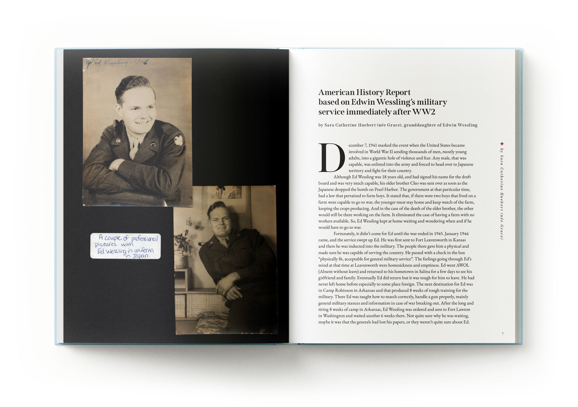 A classic serif typographic system reinforces the historical significance of the material, giving the book a timeless and elegant character. The cover features a layered collage of letters, photographs, stamps, and silk portraits of Ed and Mary Jane, which Ed commissioned while stationed in Japan.
